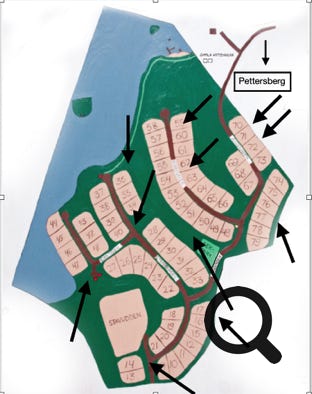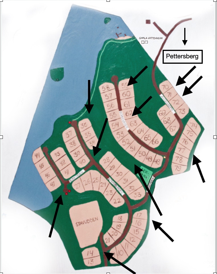 Kartan här visar var grisarna kommit in på våra tomter under 2024. OBS ! Det går att förstora bilden genom att klicka på den.